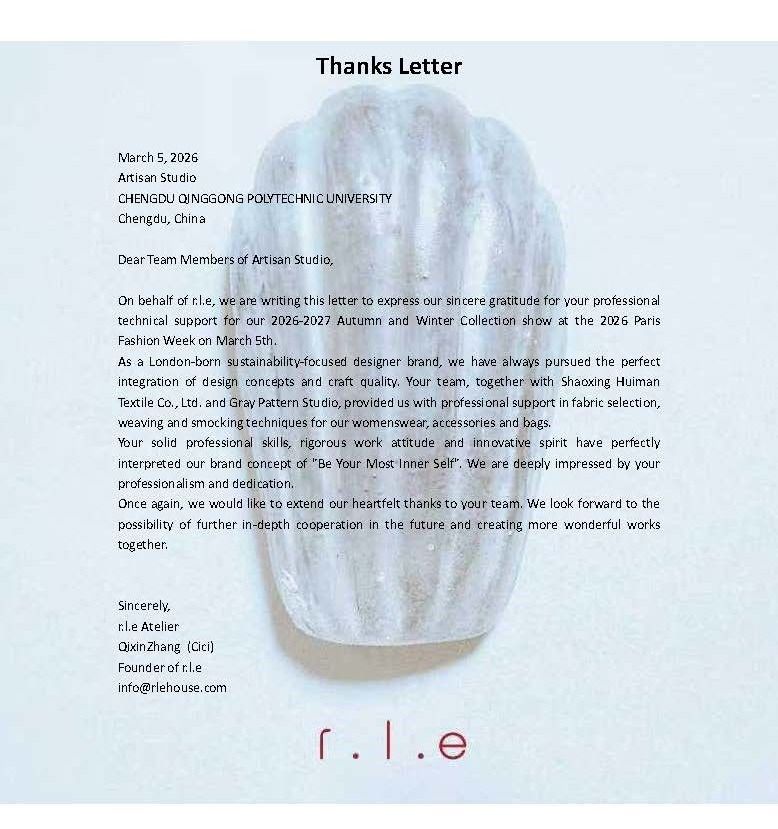 在本季备受瞩目的日程中,伦敦新锐设计师品牌r.l.e携其2026-2027 秋冬系列于3月5日惊艳亮相。这一系列作品的成功发布,背后凝聚了来自中国的匠心技艺——成都轻工职业技术大学(原成都纺织高等专科学校)的技艺工作室(Artisan Studio)团队为其提供了关键的原料选型、纹样花型深化设计及面料试制等技术赋能。
